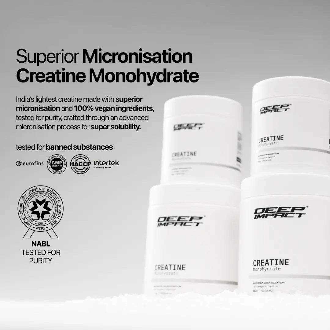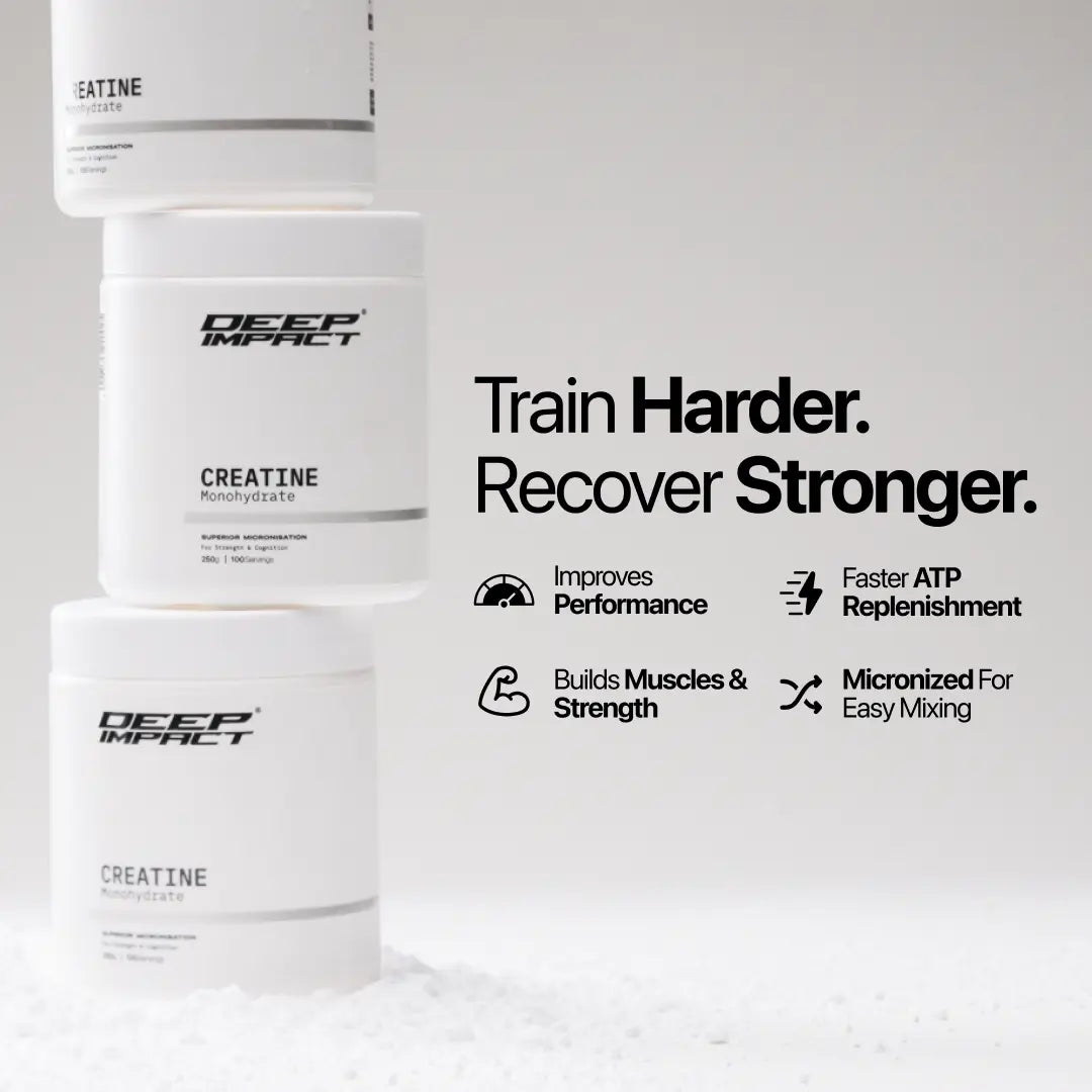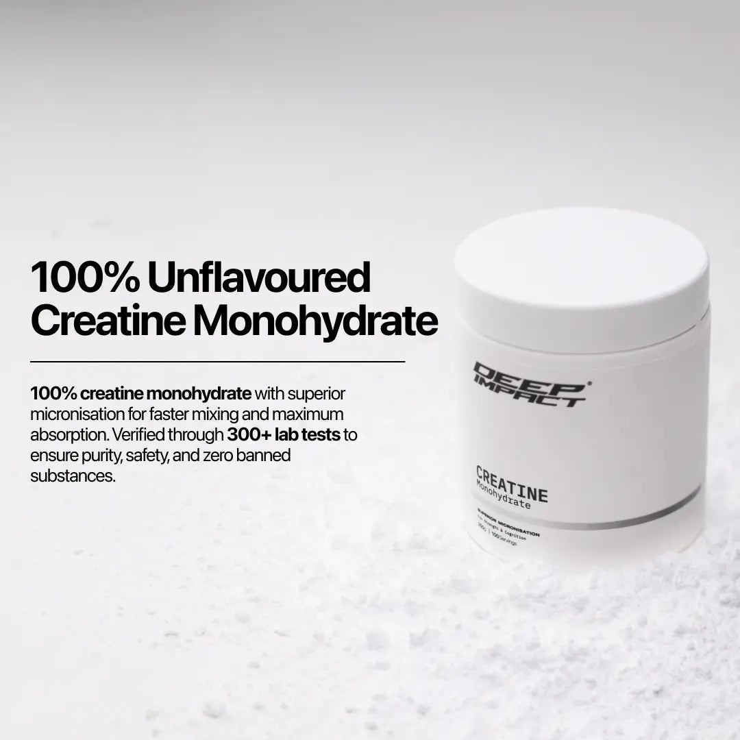 Deep Impact® Creatine Monohydrate is formulated using superior micronisation to create the lightest, smoothest mixing creatine you’ll ever use. Made from 100% vegan sources and batch-tested for purity, it delivers high absorption, zero grit, and no bloating. Clean and performance-driven — built for those who take recovery and results seriously.