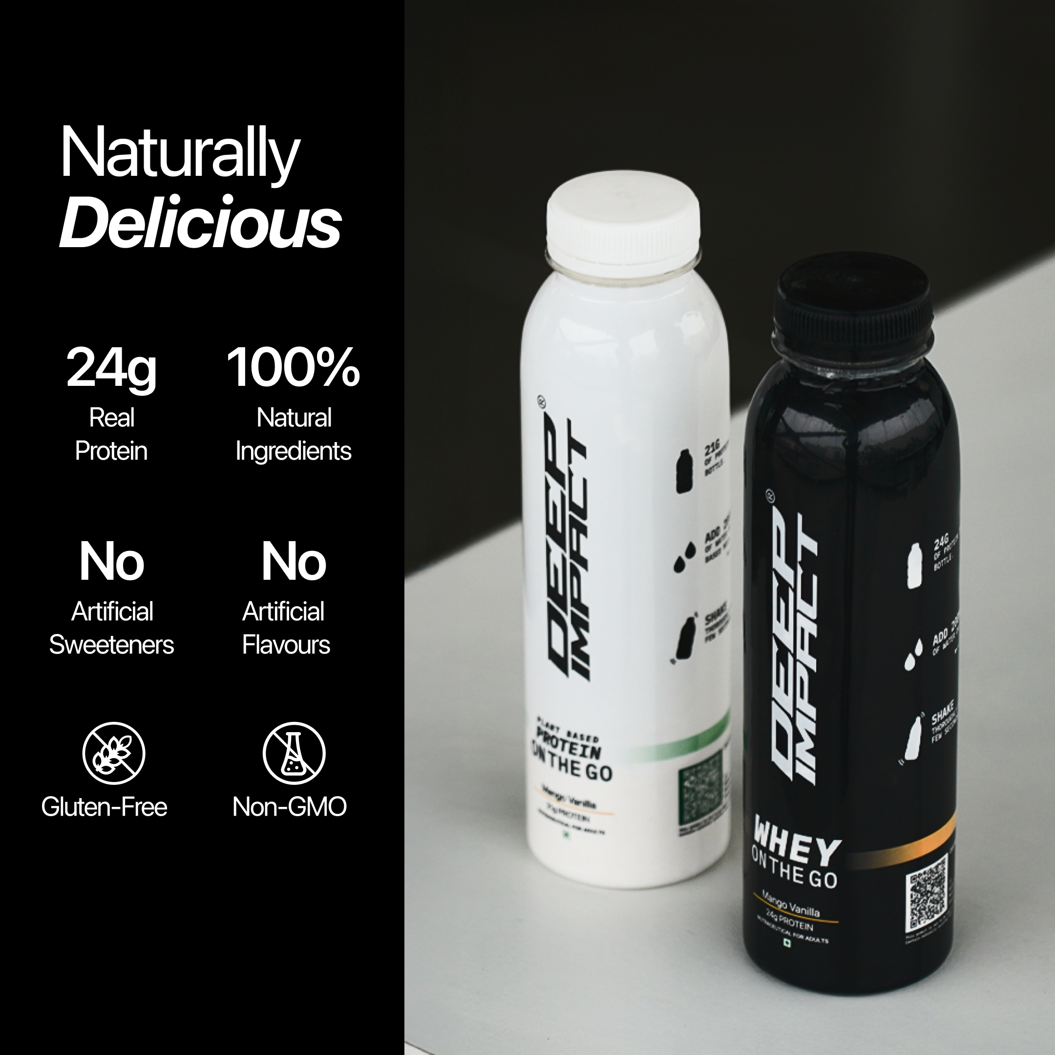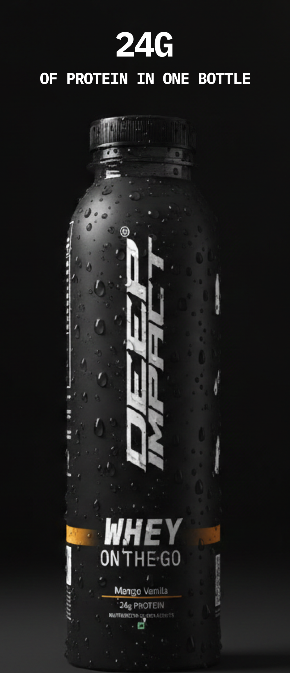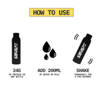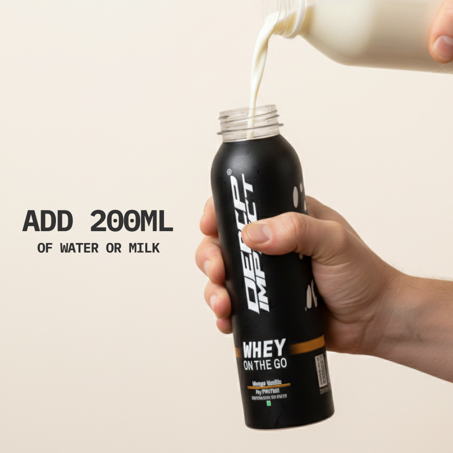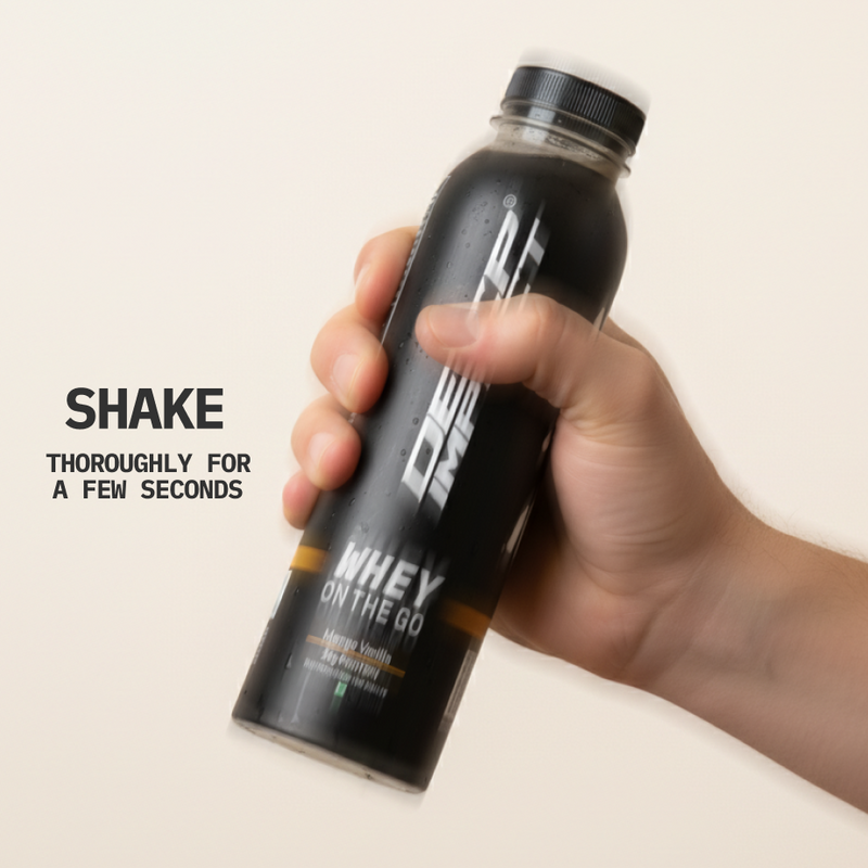 On The Go is a bottle that contains a dry scoop of 24g protein powder, sealed fresh for whenever you need it. Add water or milk, shake, and drink - no premixing, no preservatives, no shortcuts. It’s the same Deep Impact® protein you trust, made portable for real life.
