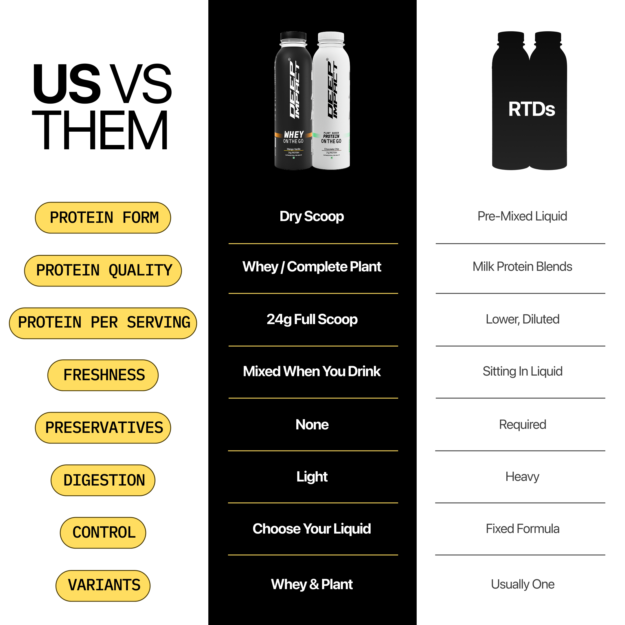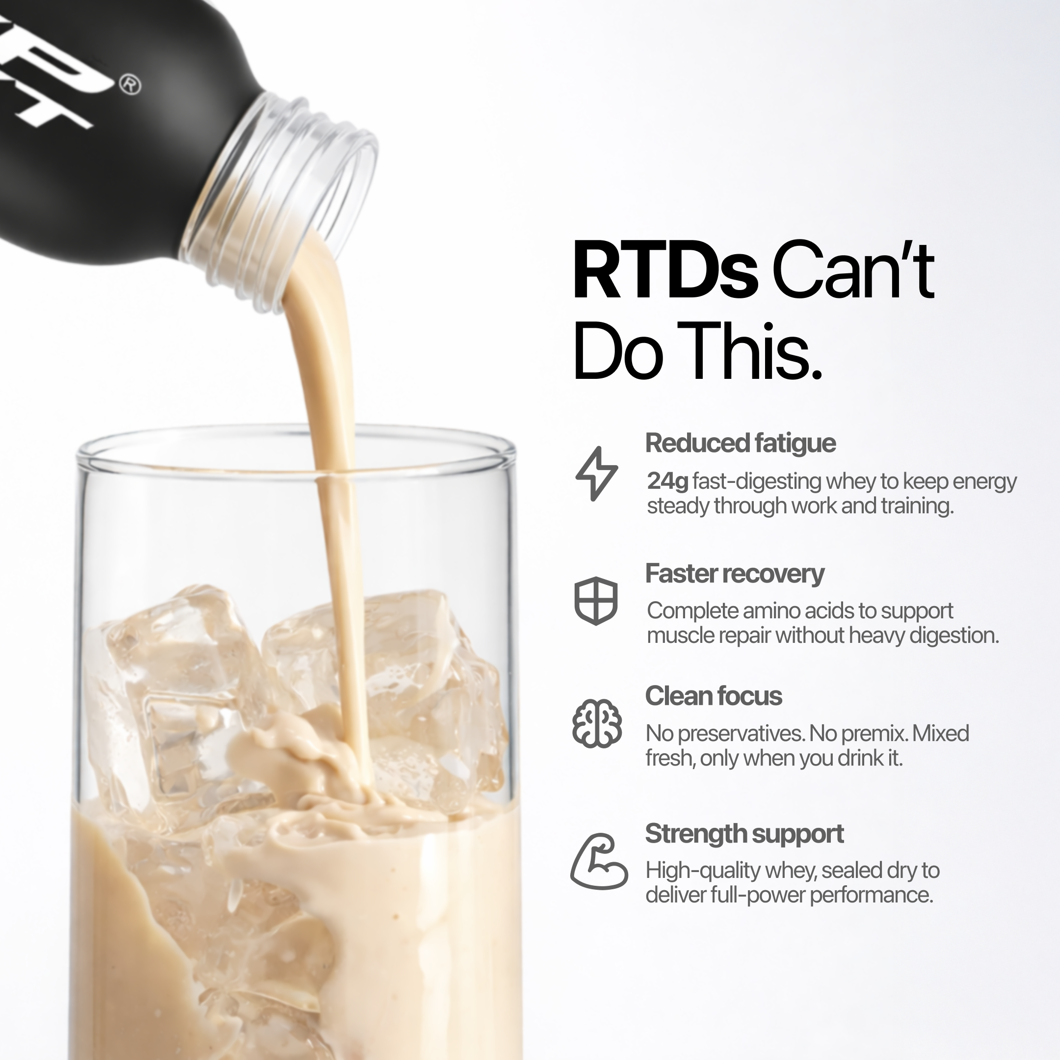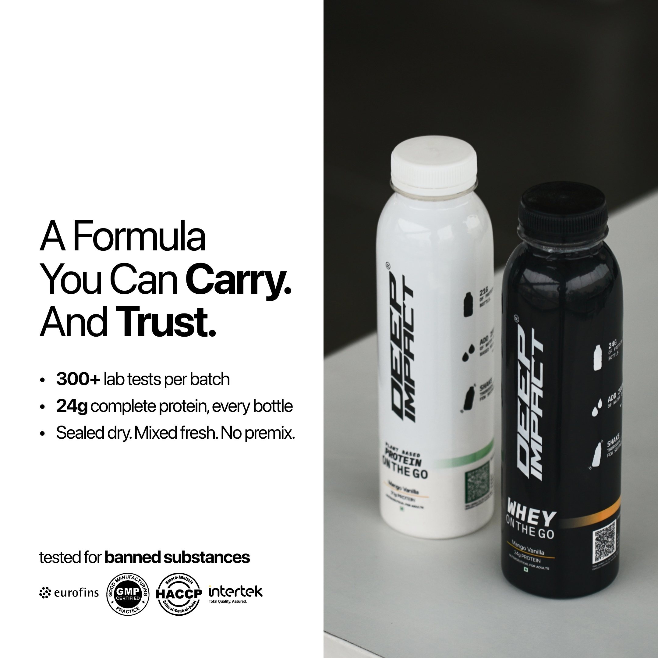 On The Go is a bottle that contains a dry scoop of 24g protein powder, sealed fresh for whenever you need it. Add water or milk, shake, and drink - no premixing, no preservatives, no shortcuts. It’s the same Deep Impact® protein you trust, made portable for real life.